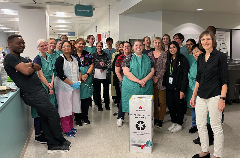 Dr. Henrike Rees (MD), a pathologist at Saskatoon City Hospital, started a glove recycling program in her pathology lab. She began the project with the hope of raising awareness about the need for climate action amongst her co-workers. She wanted the staff to see how small actions can help to change the way we do things, and more importantly, that we all need to find solutions to reduce healthcare’s carbon footprint. Dr. Rees’ commitment to improvement and her excitement about the project sparked our desire to get involved.