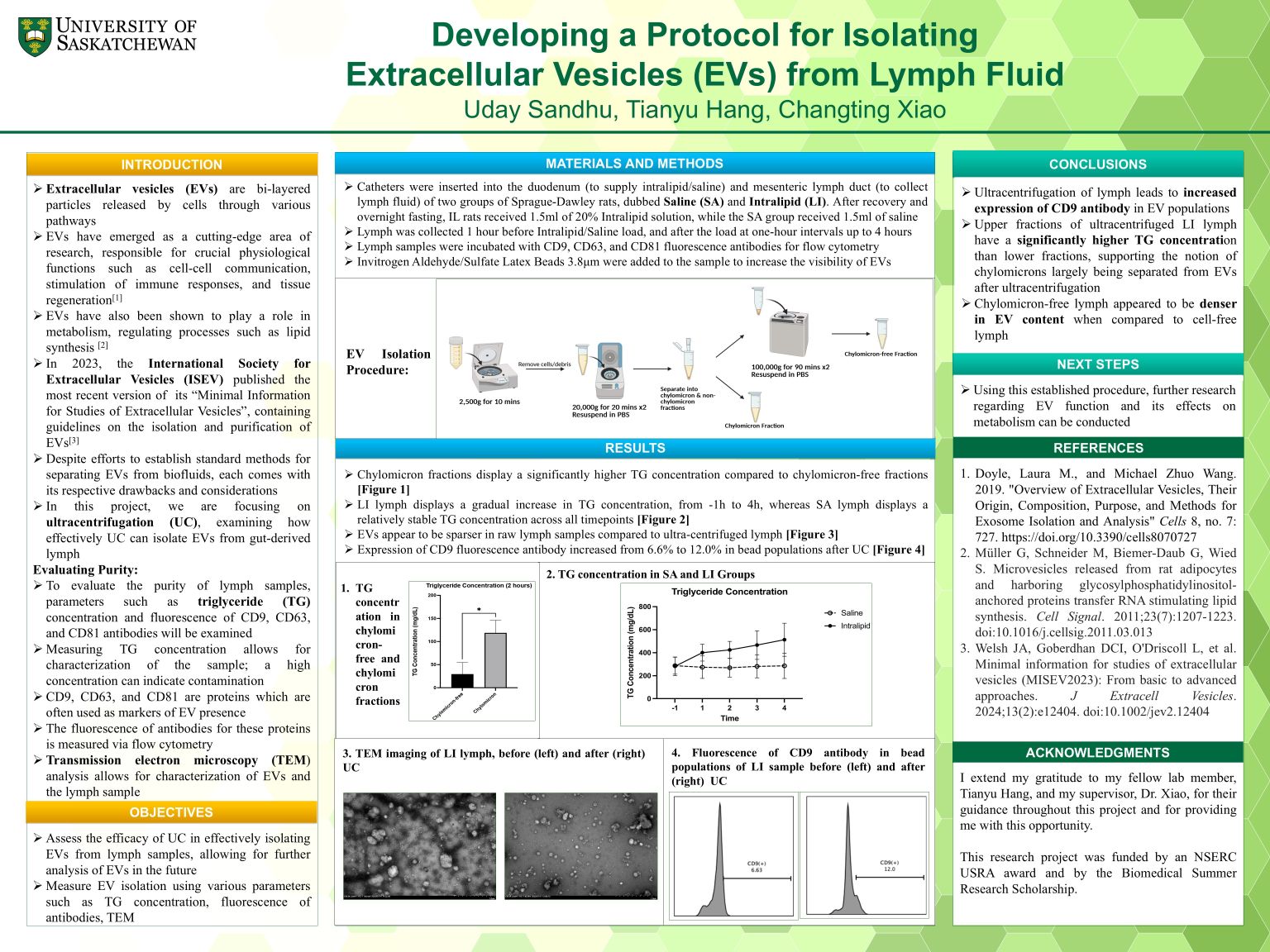 Extracellular vesicles (EVs) are bi-layered particles responsible for important physiological functions. Their link to metabolism and their exciting potential applications in medicine have sparked recent interest. This interest has necessitated protocols to be established for their isolation and study. The goal of this project is to develop an effective method for the isolation of EVs from gut-derived lymph fluid, specifically evaluating ultracentrifugation (UC) as an isolation method. Lymph was collected from the mesenteric lymph duct (MLD) of Sprague-Dawley rats before and after they had received either an Intralipid or a Saline load of 1.5 millilitres. The lymph was then centrifuged at 2,500g for 10 minutes to remove cells and debris. This cell-free lymph was centrifuged twice at 20,000g for 20 minutes, and separated into two fractions: chylomicron (upper layer) and chylomicron-free (lower layer). Finally, the chylomicron-free sample was ultracentrifuged twice at 100,000g for 90 minutes to purify the EVs. To assess the purification, parameters such as TG concentration and fluorescence of CD9, CD63, and CD81 antibodies are measured. Additionally, transmission electron microscopy (TEM) analysis allows for visualization of EV purification. This project found that centrifugation and ultracentrifugation can effectively enrich EVs in lymph fluid.