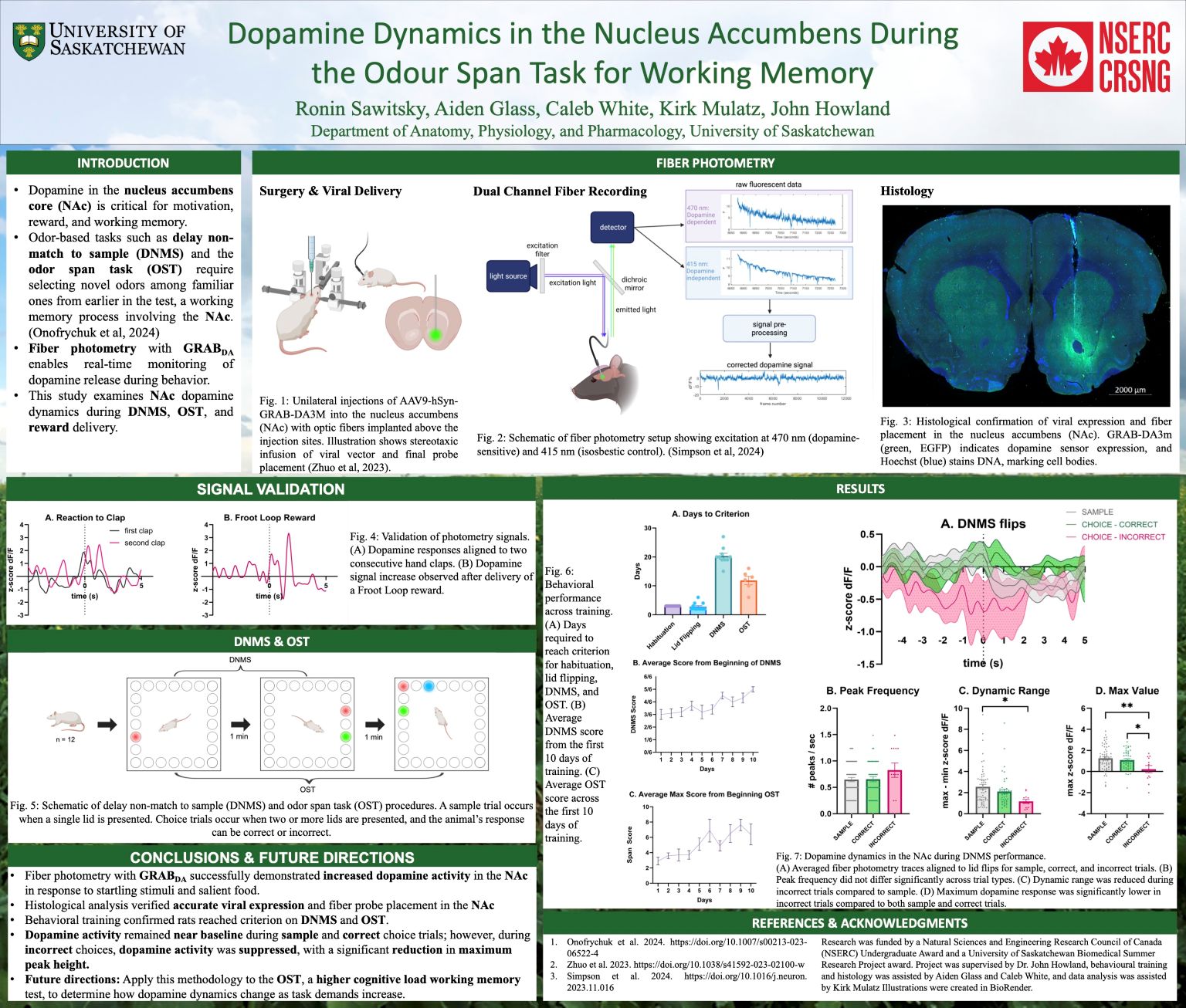 Dopamine is a neurotransmitter traditionally associated with reward, but it also plays a significant role in motivation and encoding the salience of memories. In particular, working memory—the active process of temporarily holding and manipulating information—has been implicated in dopamine dynamics in the nucleus accumbens (NAc), a brain area involved in motivated behaviours. To further investigate the role of dopamine and the NAc in working memory, we injected a viral vector encoding the dopamine sensor GRAB-DA3m into the NAc of Long-Evans rats, and implanted fiber-optic probes for fiber photometry. This allowed us to measure changes in dopamine release during behaviour trials, which we verified with salient stimuli and reward delivery. Rats were then trained on delay non-match to sample (DNMS) and the odor span task (OST), two odor-based working memory tasks. DNMS requires rats to identify a novel odor after a delay, and OST increases the cognitive load by adding additional odors to remember. Photometry recordings during DNMS revealed that dopamine activity remained near baseline during sample and correct choice trials but decreased significantly during incorrect trials. Ongoing work will apply this methodology to investigate how dopamine dynamics adapt under a higher cognitive load in the OST.