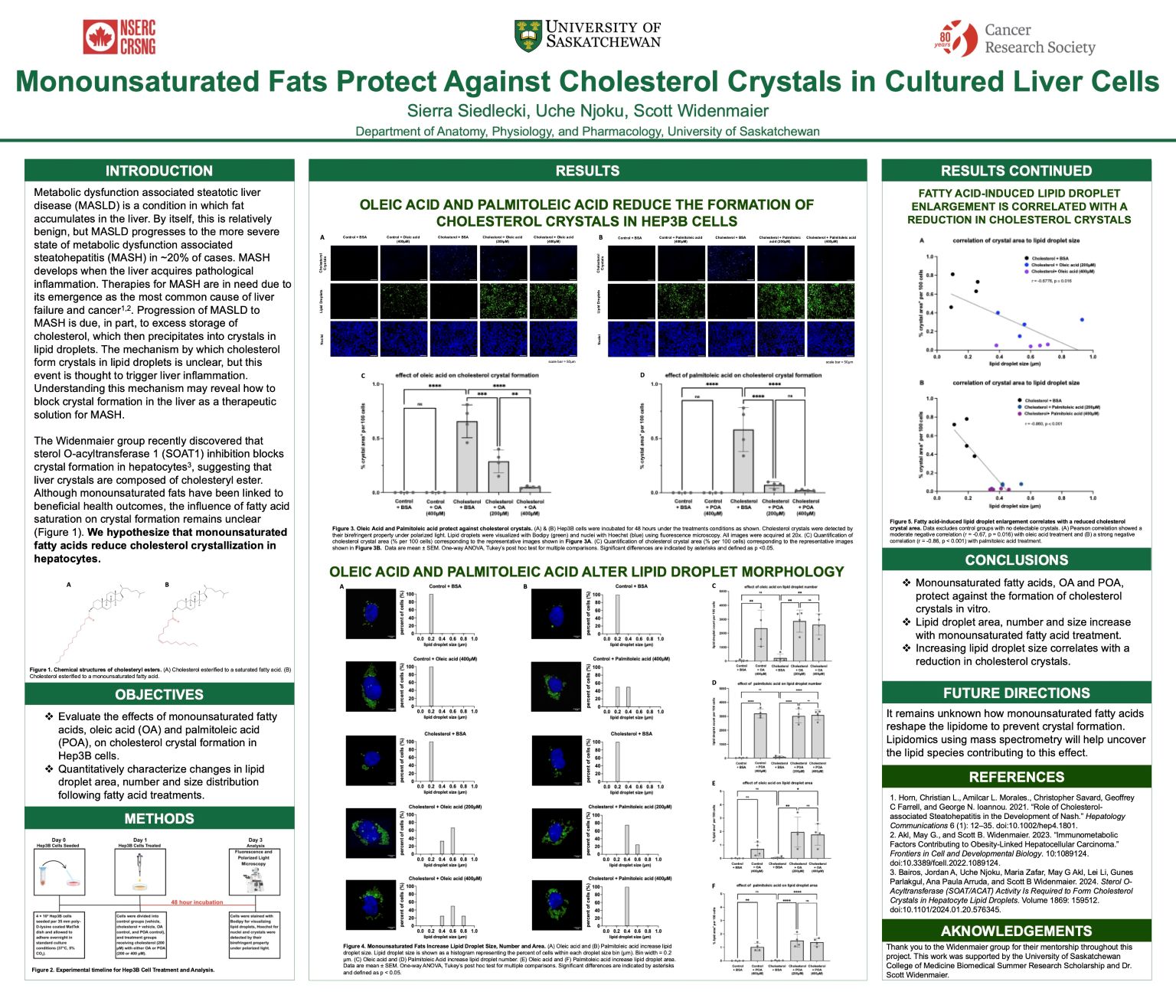 Metabolic dysfunction associated steatotic liver disease (MASLD) involves fat accumulation in the liver and can progress to the more severe state of metabolic dysfunction associated steatohepatitis (MASH). This progression is partly due to excess cholesterol precipitating into crystals, which are thought to trigger liver inflammation. Recent findings in our lab suggest liver crystals are composed of cholesteryl ester. However, the influence of fatty acid saturation on crystal formation remains unclear. We hypothesized that monounsaturated fatty acids reduce cholesterol crystallization in hepatocytes. To investigate, Hep3B cells were incubated for 48 hours following cholesterol loading and treatment with oleic acid or palmitoleic acid. At endpoint, cells were analyzed via fluorescence and polarized light microscopy. Statistical analysis was conducted using GraphPad Prism. Both fatty acids significantly reduced crystal formation and were associated with increased lipid droplet size, area, and number. This expansion of droplets inversely correlated with crystal burden, suggesting that monounsaturated fatty acids promote cholesterol solubilization within droplets and thereby prevent crystal formation. These findings indicate that fatty acid saturation can modulate hepatic cholesterol crystallization, providing a mechanistic basis for the hepatoprotective effects of monounsaturated fatty acid-enriched diets. Additionally, lipid droplet remodelling represents a potential strategy to mitigate cholesterol crystal-driven liver injury.