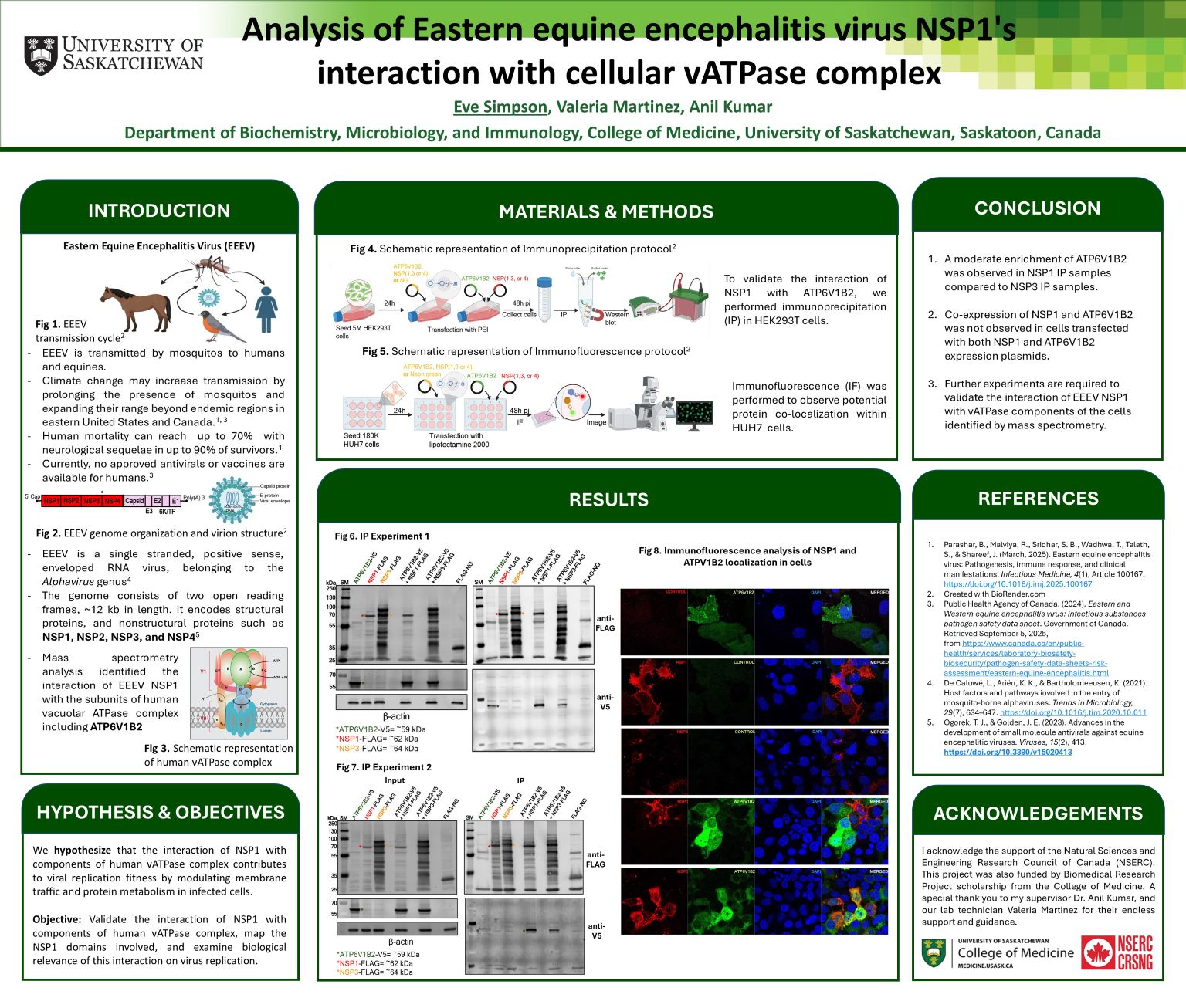 Eastern equine encephalitis virus (EEEV) is a mosquito-transmitted human pathogen endemic to eastern Canada and the U.S. The virus causes fatal encephalitis in humans. Currently, there are no approved antivirals or vaccines for humans. The Kumar lab had previously mapped the host protein interactome of all EEEV-encoded proteins using affinity purification and mass spectrometry. Components of the host Vacuolar ATPases (vATPases) machinery were identified as an interaction partner of NSP1 protein of EEEV. NSP1 is essential for viral protein translation and viral RNA capping. vATPases play roles in vesicle acidification, membrane trafficking, and protein processing. We hypothesize that NSP1 interacts with vATPases and modulate its function to enhance viral replication during infection. To validate this interaction, we transfected HEK293T cells with tagged versions of both proteins and performed co-immunoprecipitation and western blot assays. To visualize the localization of both proteins in cells, we performed immunofluorescence assay. Our experiments showed a moderate enrichment of ATP6V1B2 in NSP1 immunoprecipitation samples compared to a control viral protein. Co-localization could not be visualized as no co-expression of NSP1 and ATP6V1B2 was detected in co-transfected cells. Further experiments are needed to confirm the interaction of NSP1 with vATPase and identify its role in virus replication.