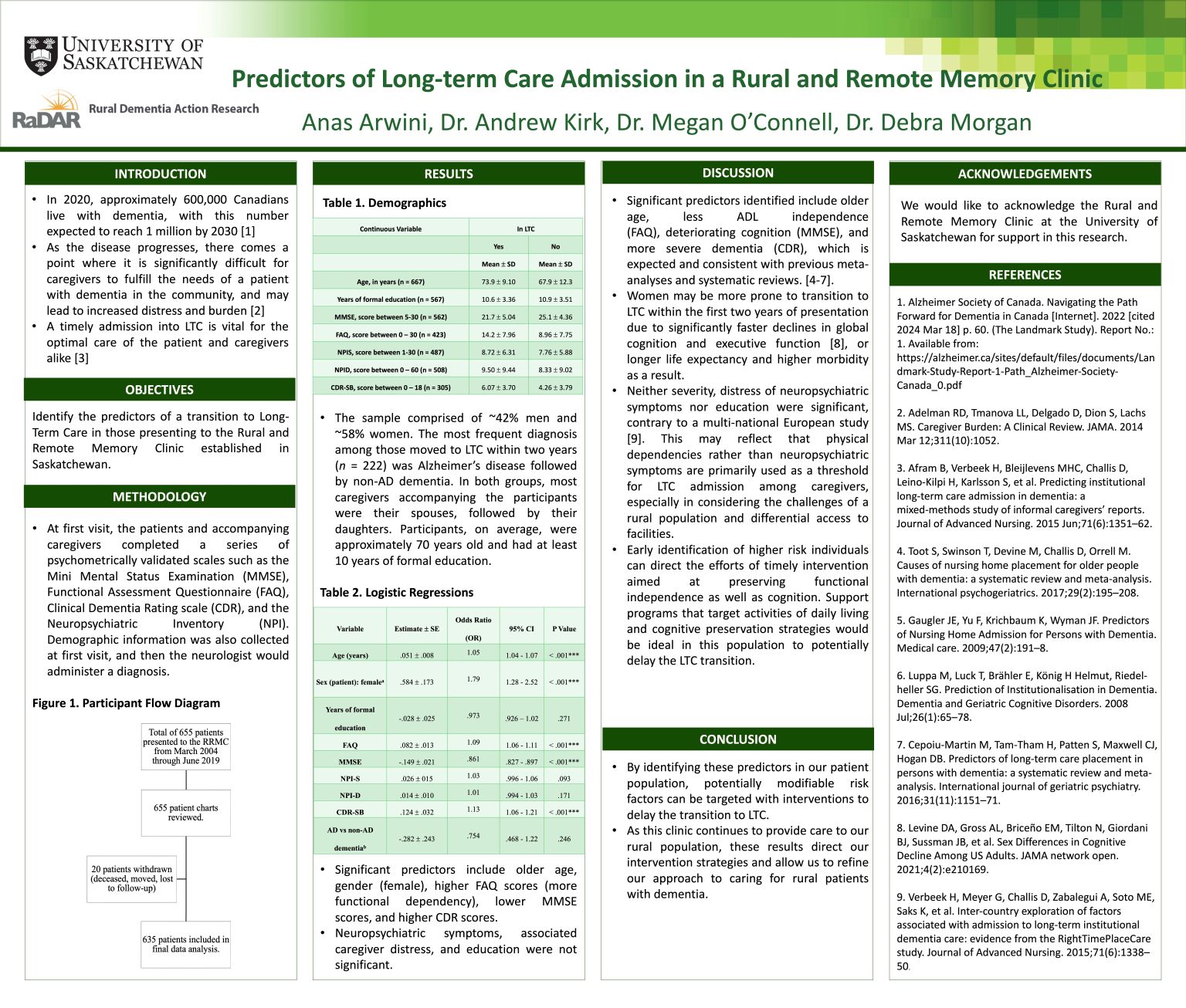 Introduction: Caregivers face unique challenges when transitioning from at-home care to long-term care (LTC). We aimed to elucidate predictors of LTC admission within two years of initial presentation to a Rural and Remote Memory Clinic (RRMC) in Saskatchewan.