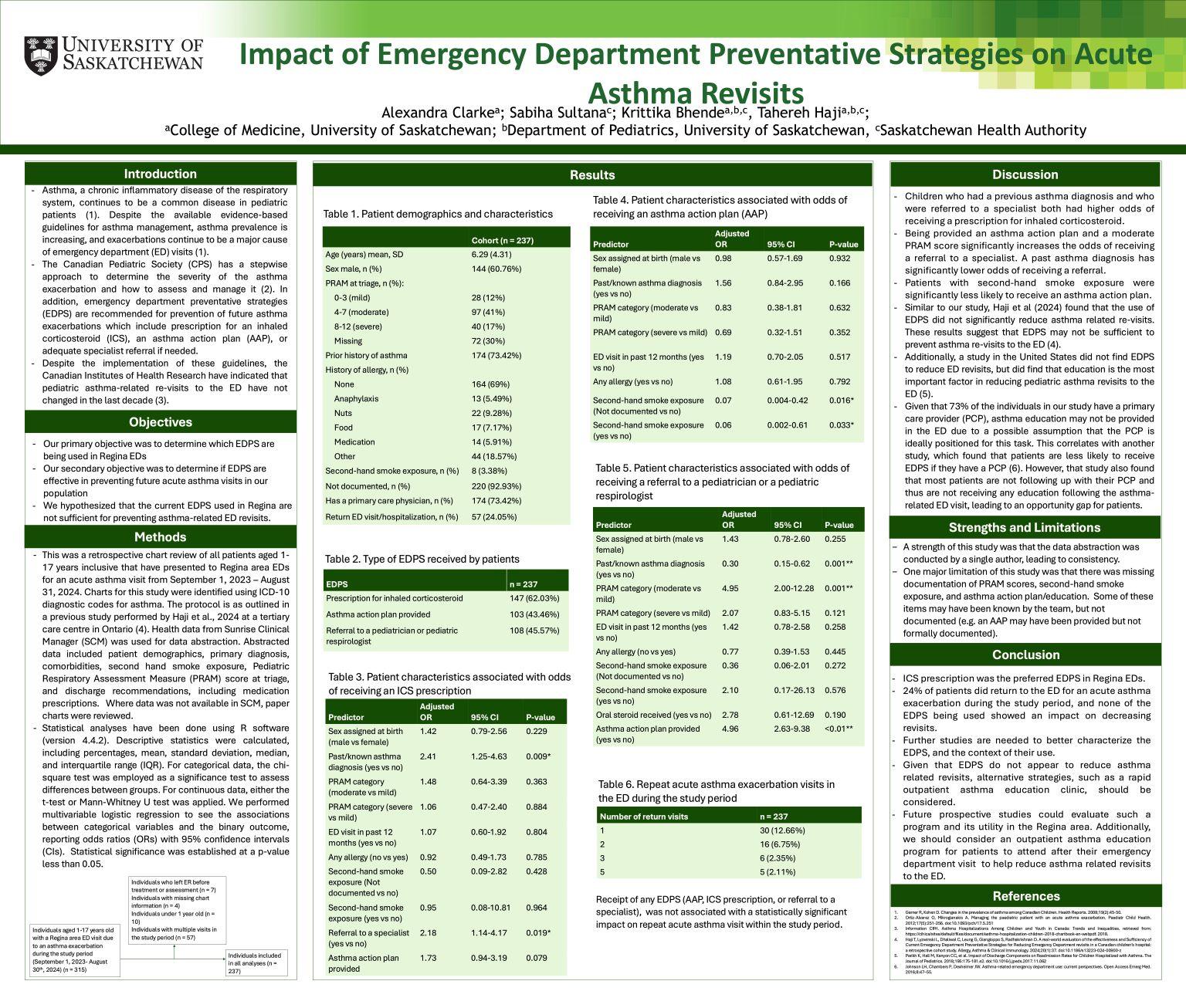 Despite the available evidence-based guidelines for asthma management, asthma prevalence is increasing, and exacerbations continue to be a major cause of emergency department (ED) visits (1). Therefore, we aimed to determine which emergency department preventative strategies (EDPS) are being implemented in Regina EDs and if these strategies effectively prevent asthma-related ED revisits. We hypothesized that the current EDPS used in Regina are not sufficient for preventing asthma revisits. We conducted a retrospective chart review of all patients aged 1-17 years inclusive that have presented to Regina area EDs for an acute asthma exacerbation from September 1, 2023 – August 31st, 2024. EDPS included the provision of a prescription for the inhaled corticosteroid, an asthma action plan (AAP), and/or referral to a pediatrician or pediatric respirologist. 315 patients were identified, and 237 patients met the inclusion criteria. Inhaled corticosteroid prescription was the preferred EDPS for preventing asthma exacerbation-related revisits to the ED. However, 24% of patients returned to the ED for an acute asthma exacerbation during the study period, and none of the EDPS demonstrated an impact on decreasing revisits. Further studies are needed to better characterize the EDPS and the context of their use, and outpatient asthma education programs for post-ED visits should be considered.