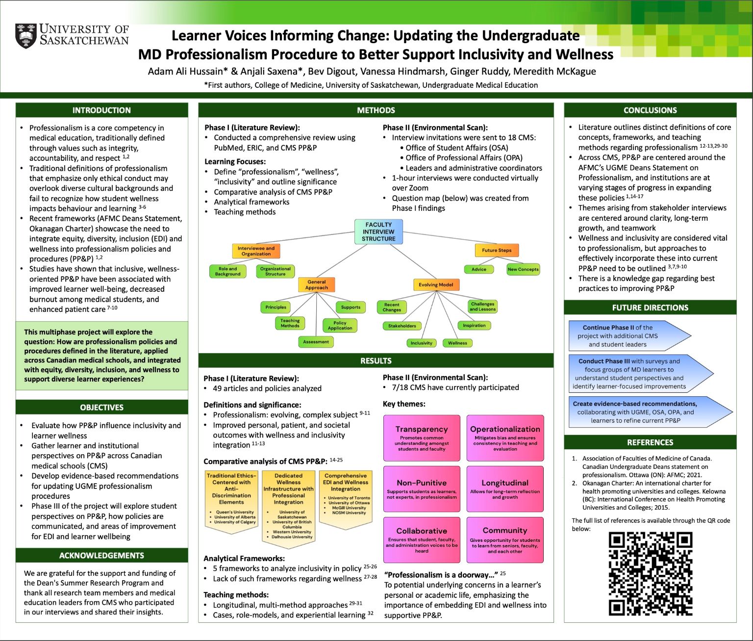 Results: Phase I showed multiple analytical frameworks for PP&P, evolving teaching methods, and variation in wellness/EDI integration across institutions. Phase II included 7/18 interviews identifying 6 key themes: transparency, operationalization, non-punitive approaches, longitudinal learning, collaborative development, and community-based learning.