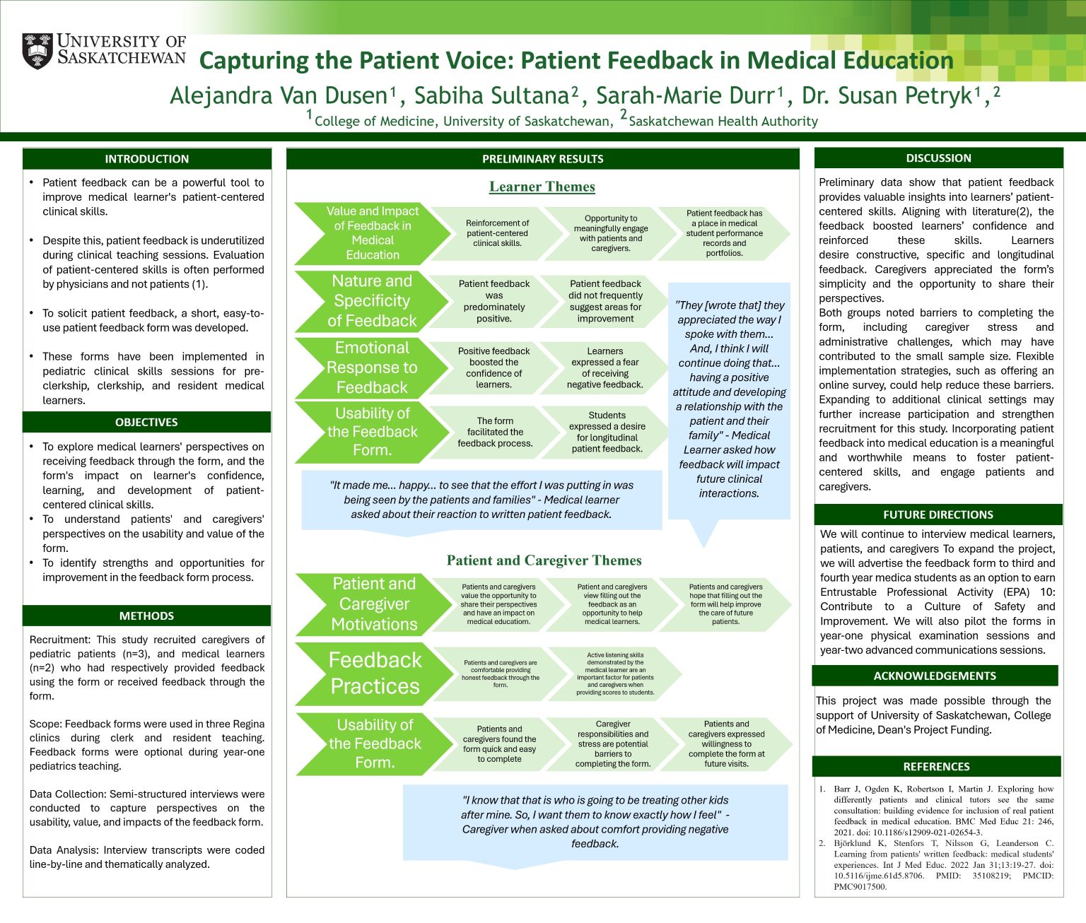 The form was piloted in three pediatric outpatient clinics in Regina during clerkship and resident teaching, and offered as an opt-in program for first-year medical students during pediatric encounters. Our study examined the form’s impact, value, and usability from the perspectives of medical learners and caregivers.