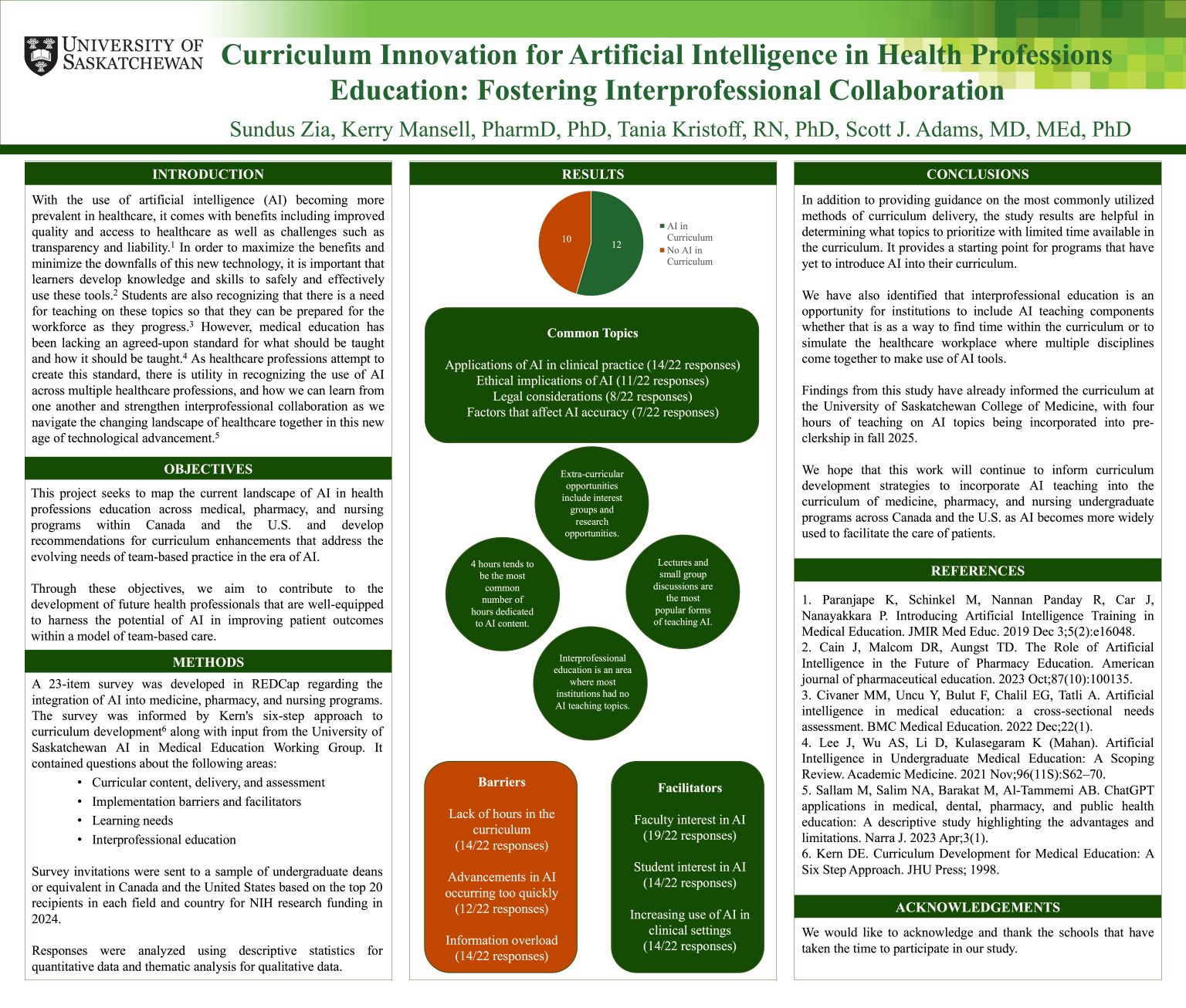 Results: Among programs which have incorporated teaching on AI, the median number of hours dedicated to AI was 4 hours (interquartile range: 3-4). The most frequent topics were applications of AI in clinical practice (14/22 responses) and ethical implications of AI (11/22 responses). The top facilitators for integrating AI into the curriculum were faculty interest in AI (19/22 responses), student interest (14/22 responses), and increasing use of AI in clinical settings (14/22 responses). The top barriers were lack of hours in the curriculum (14/22 responses), advancements in AI occurring too quickly (12/22 responses), and information overload (14/22 responses).