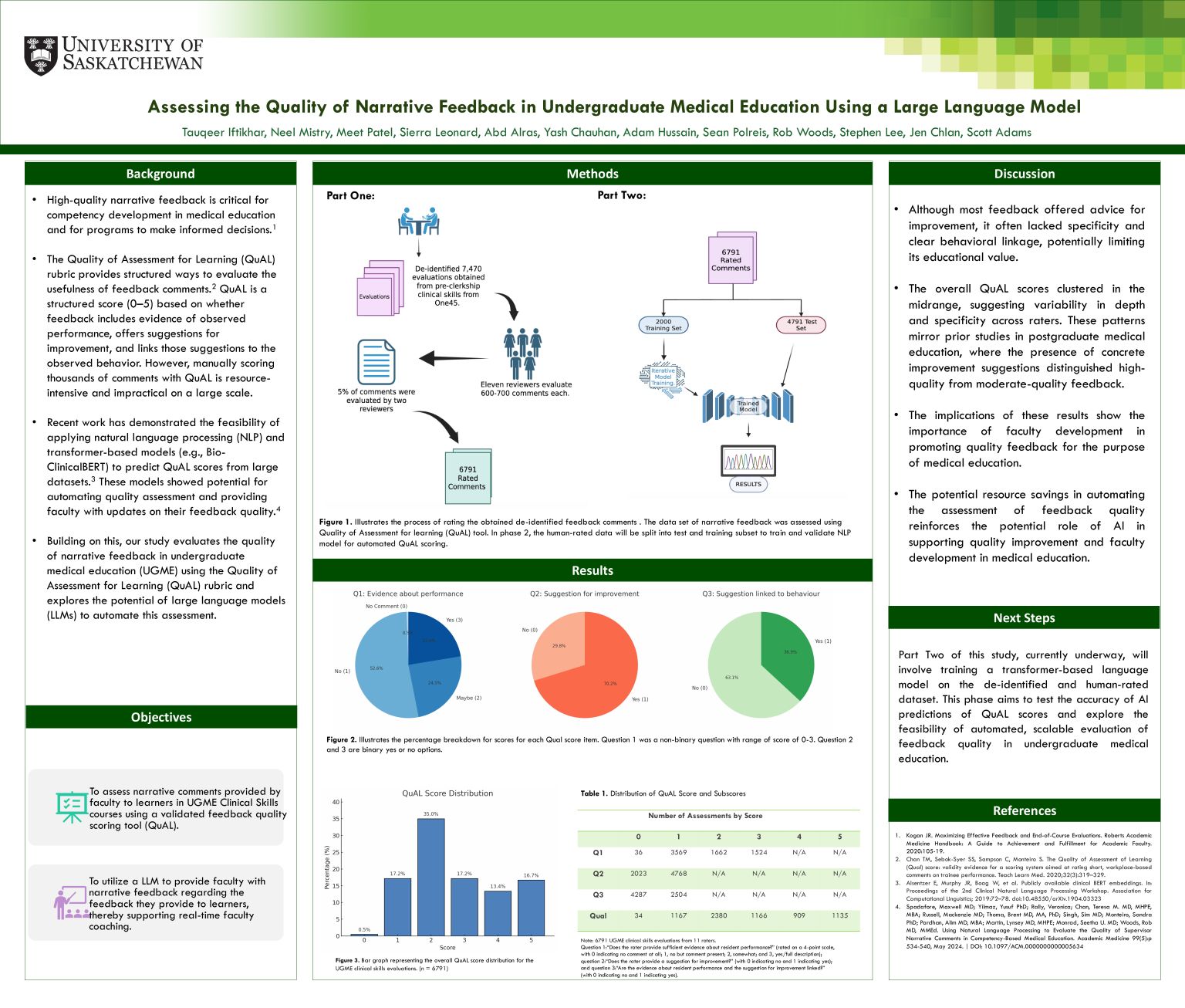 Discussion: Most feedback offered advice for improvement, however, it often lacked specificity and clear behavioral linkage, potentially limiting its educational value. Evidence of learner performance was also often insufficient. This human-rated dataset will next be used to train and validate an NLP model for automated QuAL scoring and developing a model for real-time feedback coaching.