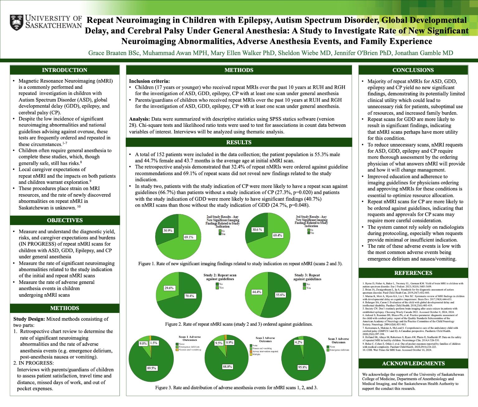 Methods: We conducted a mixed-methods study: a 10-year retrospective review of repeat nMRIs for children in Saskatchewan with ASD, GDD, epilepsy, or CP who underwent at least one anesthetized scan, and prospective caregiver interviews (ongoing) exploring caregiver expectations and burdens.