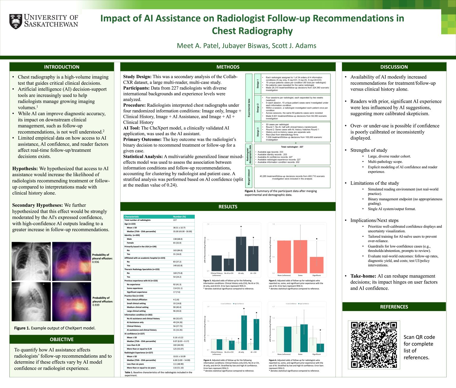 Methods: We conducted a secondary analysis of Collab-CXR, a large multi-reader, multi-case study. Two hundred twenty-seven radiologists made 40,285 treatment/follow-up decisions across 493,710 evaluations under four randomized conditions: image only, history, AI, and history+AI. Generalized linear mixed models were used to estimate the odds of recommending treatment or follow-up.