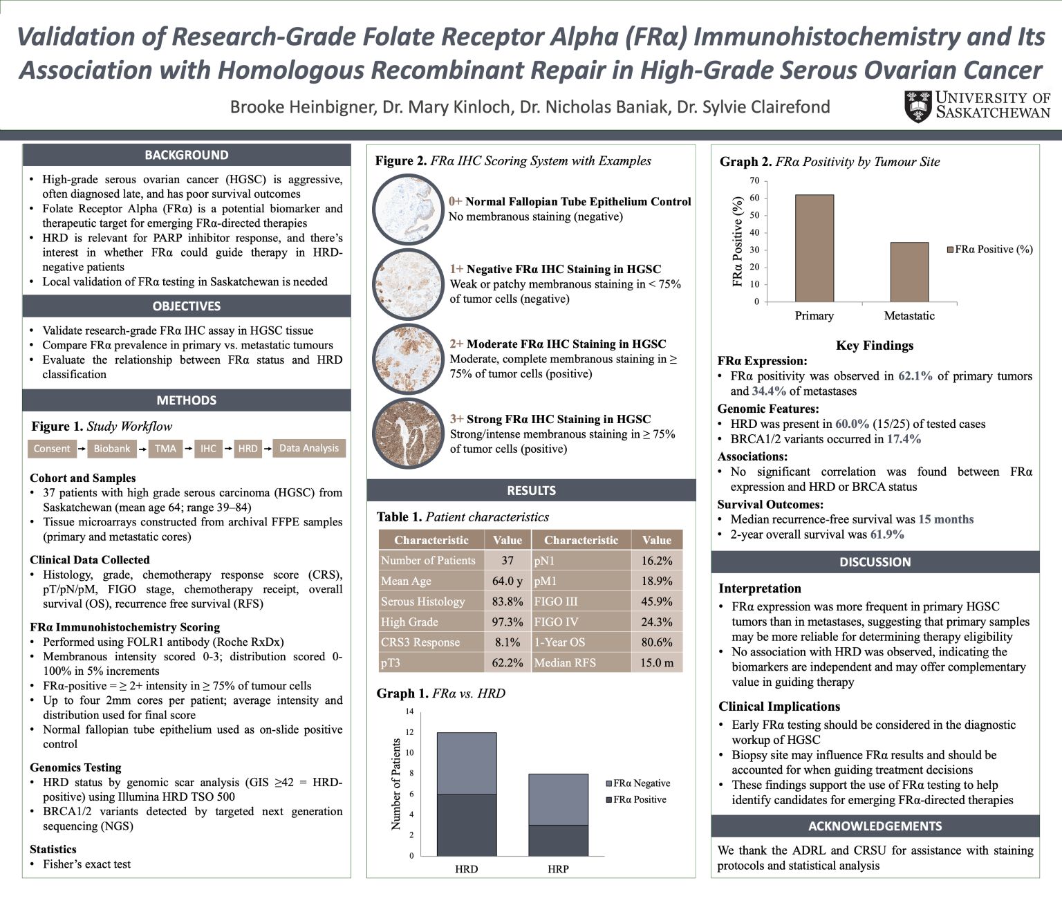 Methods: Archival specimens from 37 HGSC patients in Saskatchewan were assembled into tissue microarrays containing primary (n = 29) and metastatic (n = 32) cores. FRα immunohistochemistry was performed with a research-grade antibody and scored by intensity (0–3+) and distribution, with ≥2+ staining in ≥75% of tumor cells defined as positive. Genomic testing (n = 25) assessed homologous recombination deficiency (HRD; genomic instability score ≥ 42) and BRCA1/2 variants. Clinical and outcome data were analyzed with Fisher’s exact and log-rank tests.