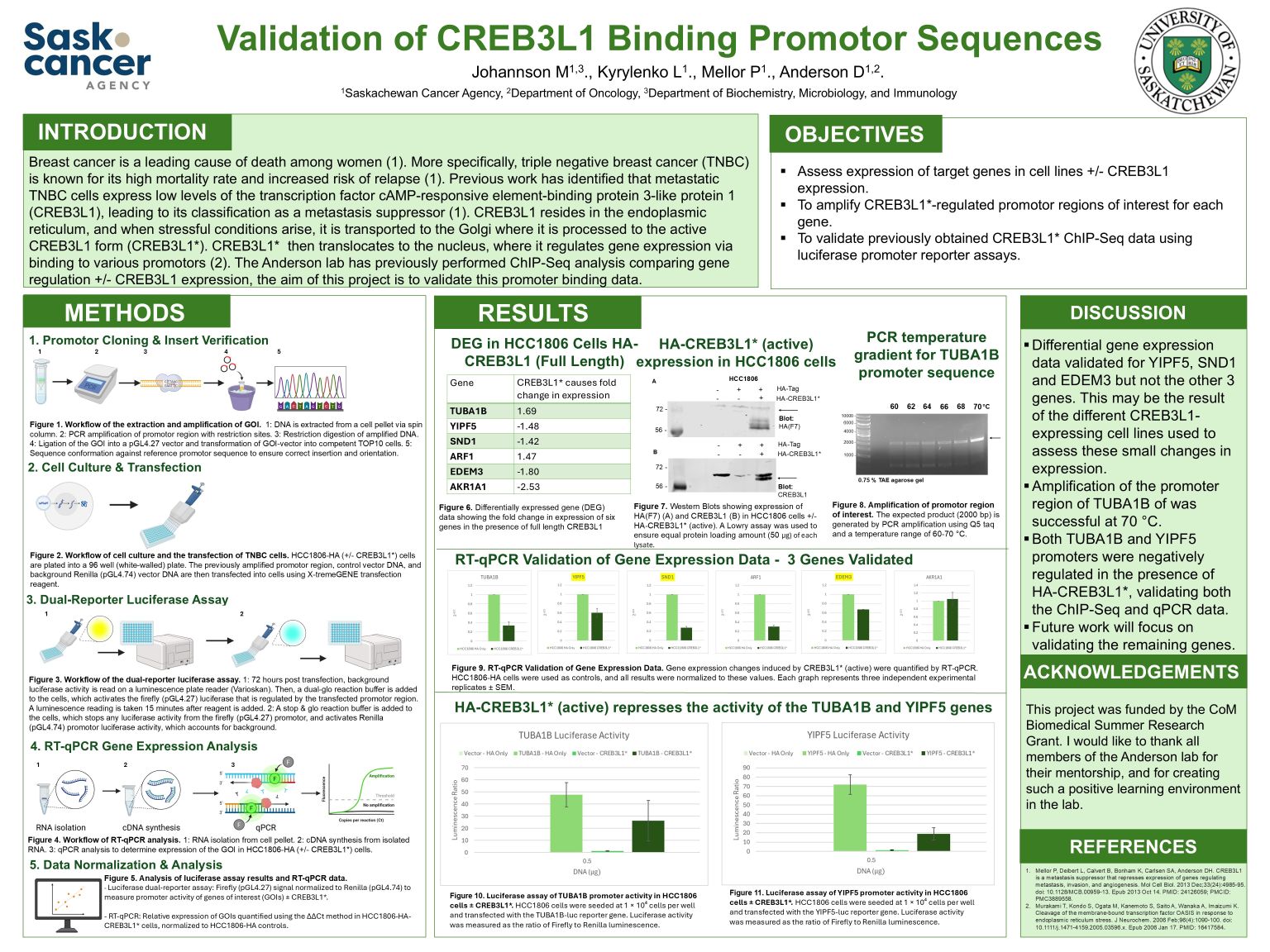 Triple negative breast cancer (TNBC) is known for its high mortality rate and risk of relapse, which is often accredited to a lack of targeted therapies. Previous work in the Anderson lab showed that cAMP-responsive element-binding protein 3-like protein 1 (CREB3L1), an anti-metastatic transcription factor, is downregulated in metastatic TNBC cells. CREB3L1 is found in the endoplasmic reticulum and is transported to the Golgi to be cleaved into active CREB3L1 (CREB3L1*) upon exposure to stress. CREB3L1* then enters the nucleus, binding to various promoters and regulating their expression. Previously, ChIP-seq identified genes directly regulated by CREB3L1*. This experiment aimed to validate these ChIP-seq findings and determine if CREB3L1* positively or negatively regulates gene expression. The genes of interest were isolated and amplified from gDNA, then validated via RT-qPCR and luciferase dual-reporter assays. Out of the six genes tested via RT-qPCR, three (SND1, YIPF5, EDEM3) showed results consistent with ChIP-seq findings, while the other three (TUBA1B, ARF1, AKR1A1) did not. For the luciferase dual-reporter assay, two genes were examined: YIPF5, which validated the ChIP-seq result, and TUBA1B, which did not.