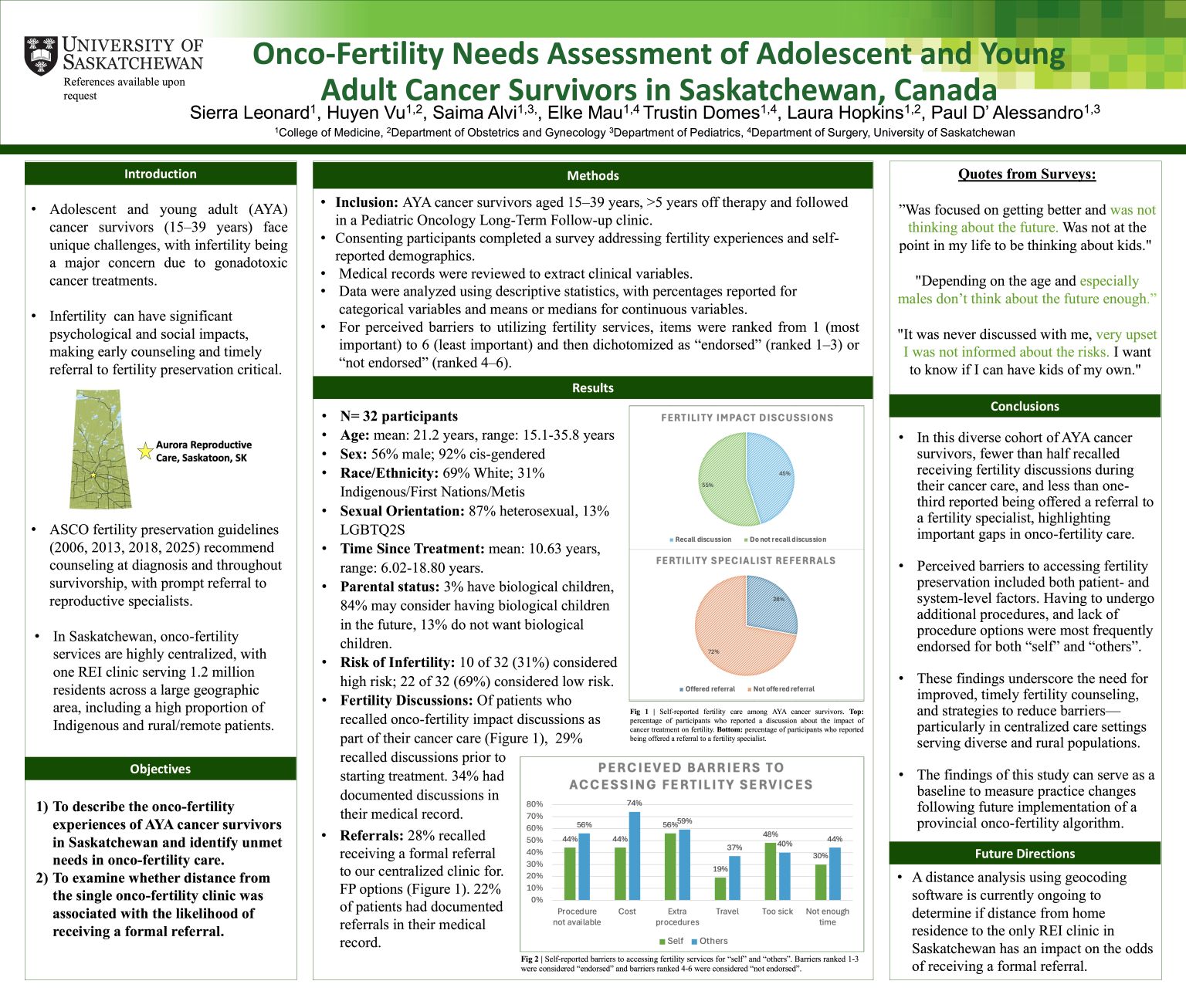 Introduction: Infertility is a major concern for pediatric and adolescent/young adult (AYA) cancer patients due to gonadotoxic treatments. Timely onco-fertility counselling and referral to fertility preservation (FP) specialists are now standards of care. In Saskatchewan, there is only one fertility clinic serving 1.2 million residents across 651,900 km². We aimed to capture the experiences of a cohort of AYA cancer survivors followed in our tertiary pediatric hospital.