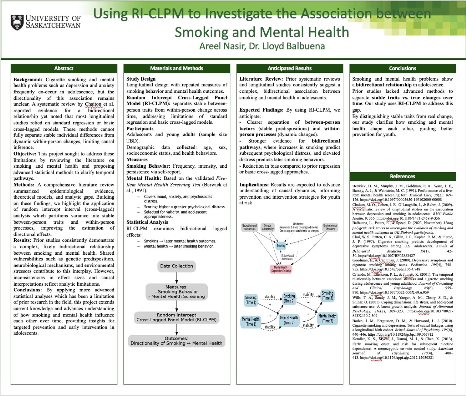 Objective: This project sought to address these limitations by reviewing the literature on smoking and mental health and proposing advanced statistical methods to clarify temporal pathways.