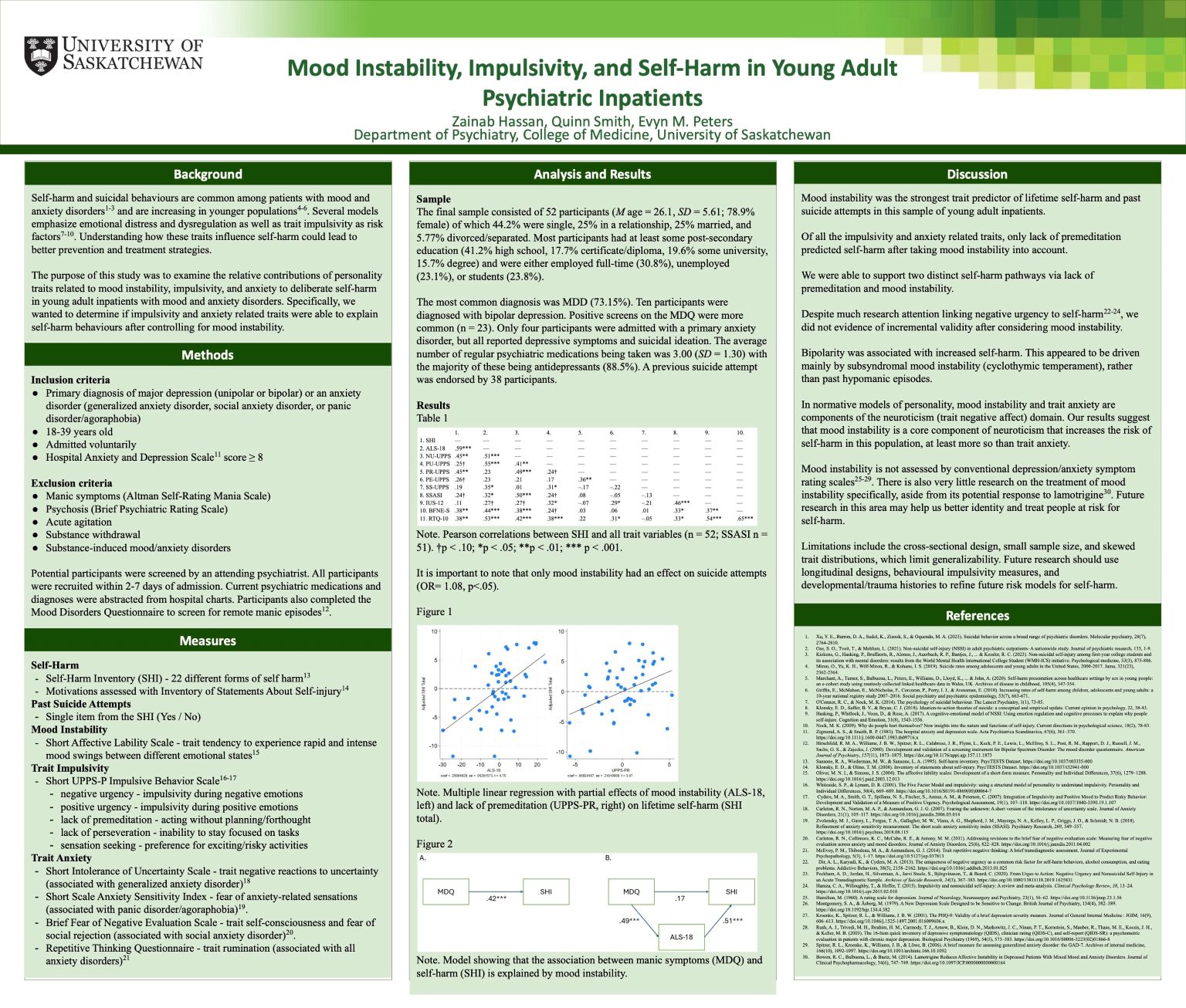Methods: Self-report questionnaires were completed by 52 young adult psychiatric inpatients. Mood instability and impulsivity were assessed with short versions of the Affective Lability and UPPS-P Impulsive Behaviour Scales. Anxiety-related traits were also measured, namely intolerance of uncertainty, anxiety sensitivity, fear of negative evaluation, and repetitive thinking. The Self-Harm Inventory was used to assess lifetime self harm. Sequential regression was used to identify traits with unique effects on self-harm.