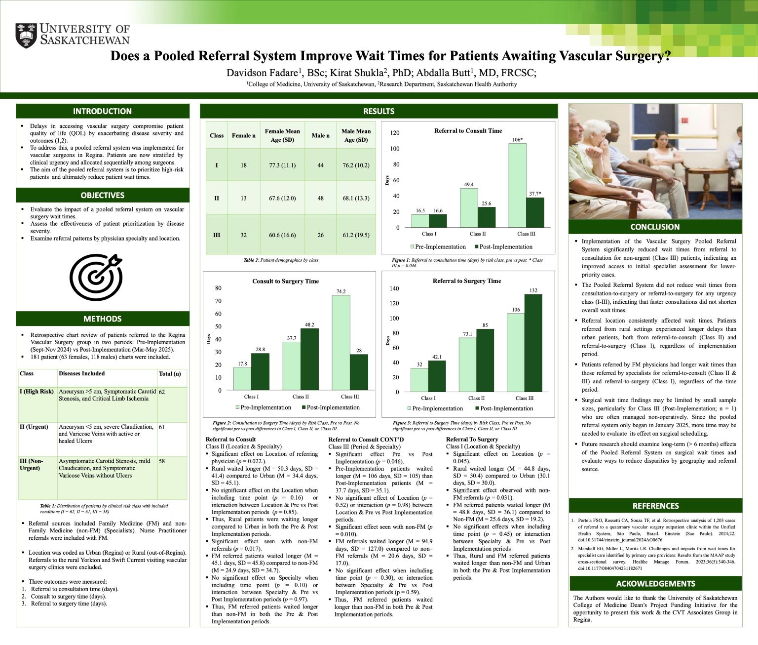 Methods: A retrospective chart review was conducted on 181 patients referred to vascular surgery during two time periods: Sept - Nov 2024 (pre-implementation) and Mar - May 2025 (post-implementation). Referral source (Family Medicine (FM) vs. non-FM) and location (urban vs. rural) were included. Wait times from referral-to-consult, consult-to-surgery, and referral-to-surgery was analyzed.