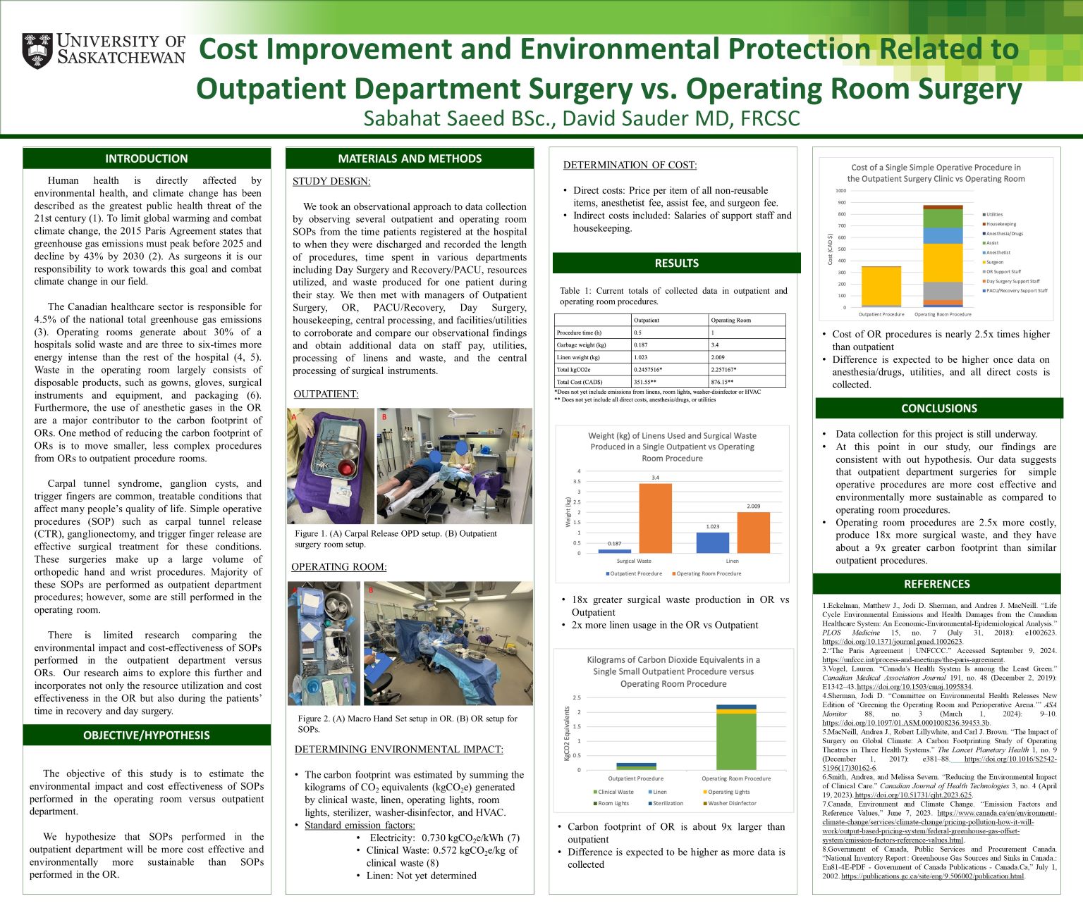 Introduction: The Canadian healthcare sector is responsible for 4.5% of the national total greenhouse gas emissions (3). Operating rooms (ORs) generate about 30% of a hospitals’ solid waste and are three to six-times more energy intensive than the rest of the hospital (4, 5). One method of reducing the carbon footprint of ORs is to move simple operative procedures (SOPs) from ORs to outpatient procedure rooms.